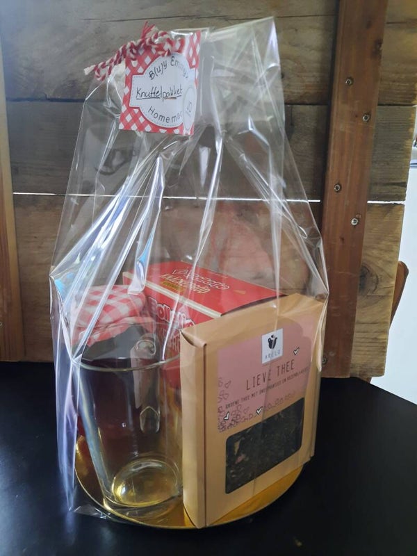 Het pakket bestaat uit jam, crackers (of beschuit), Lieve thee (groene thee met suikerhartjes en rozenblaadjes) en een theeglas.